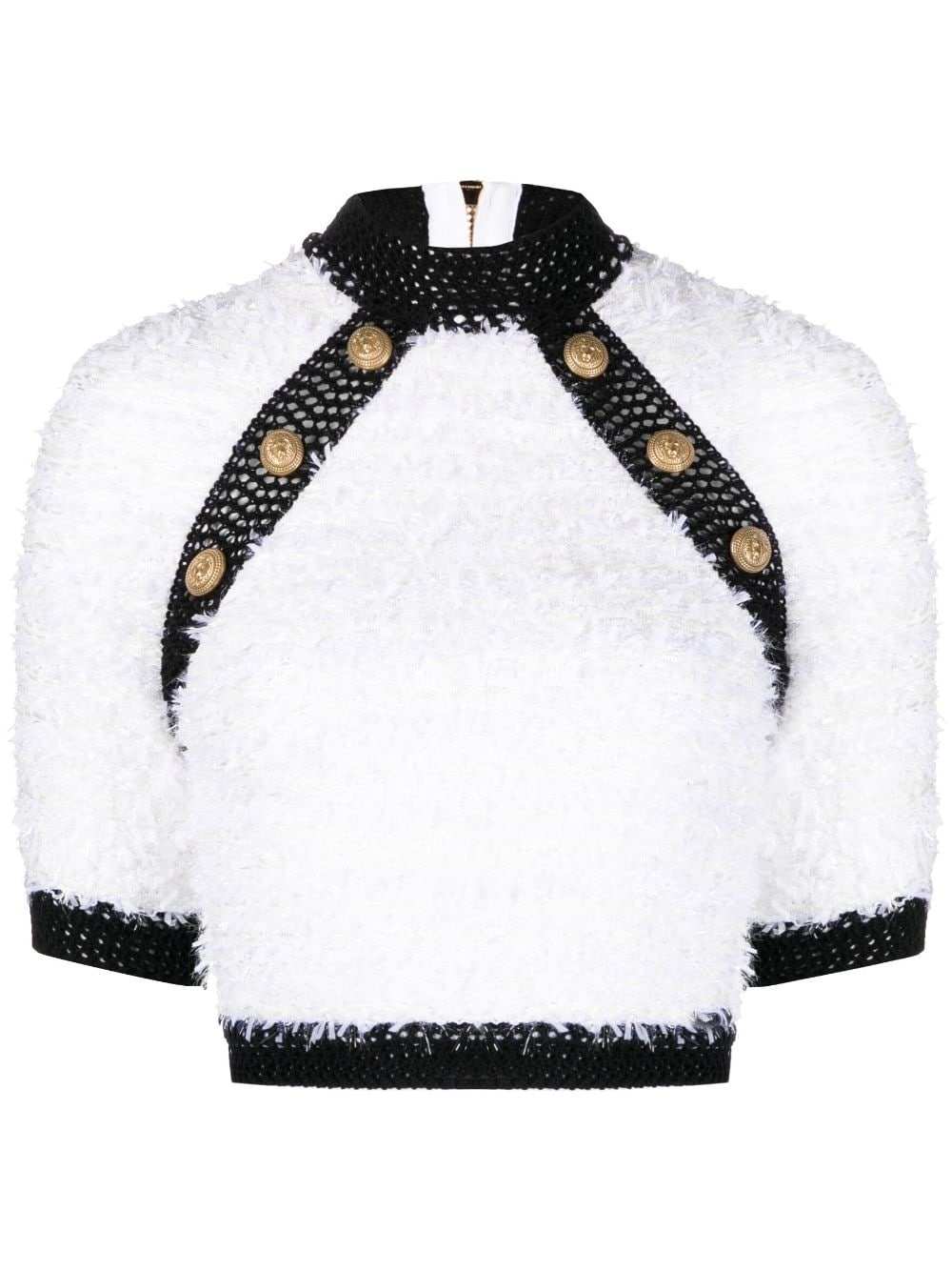 button-embellished tweed crop top Balmain juxtaposes its French heritage with a modern sensibility. A case in point, this crop top is crafted from fuzzy tweed and framed with open-knit black trims. Signature embossed gold-tone buttons at the shoulders make for a recognisable finishing touch. Highlights - Black/white - Tweed - Embossed gold-tone buttons - Mock neck - Short raglan sleeves - Cropped - Straight hem Made in France Composition Polyamide 33%, Viscose 32%, Polyester 27%, Cotton 8% SIZE & FIT Model measurements Height 5 ft 10 in(1.79 m) Bust/Chest 31.1 in(79 cm) Hips 35.03 in(89 cm) Waist 24.01 in(61 cm) Washing instructions Dry Clean Only