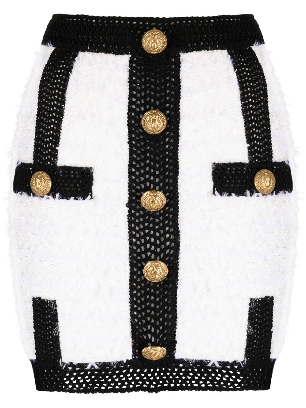 button-embellished tweed miniskirt Balmain's miniskirt puts the label's signature bold aesthetic on full show. It's made from tactile white tweed, punctuated by black open-knit trims and embellished with chunky gold-tone buttons embossed with lion heads. Highlights - Black/white - Tweed - Crochet panelling - Decorative button detailing - High-waisted - Rear zip fastening Made in France Composition Polyamide 33%, Viscose 32%, Polyester 27%, Cotton 8% SIZE & FIT Model measurements Height 5 ft 10 in(1.79 m) Bust/Chest 31.1 in(79 cm) Hips 35.03 in(89 cm) Waist 24.01 in(61 cm) FittingInformation This mini-length skirt is intended to be worn just below the waist The elasticated waist allows for a comfortable fit Made with a midweight knit, this piece offers some stretch This piece fits true to size – take your usual size