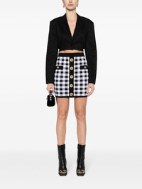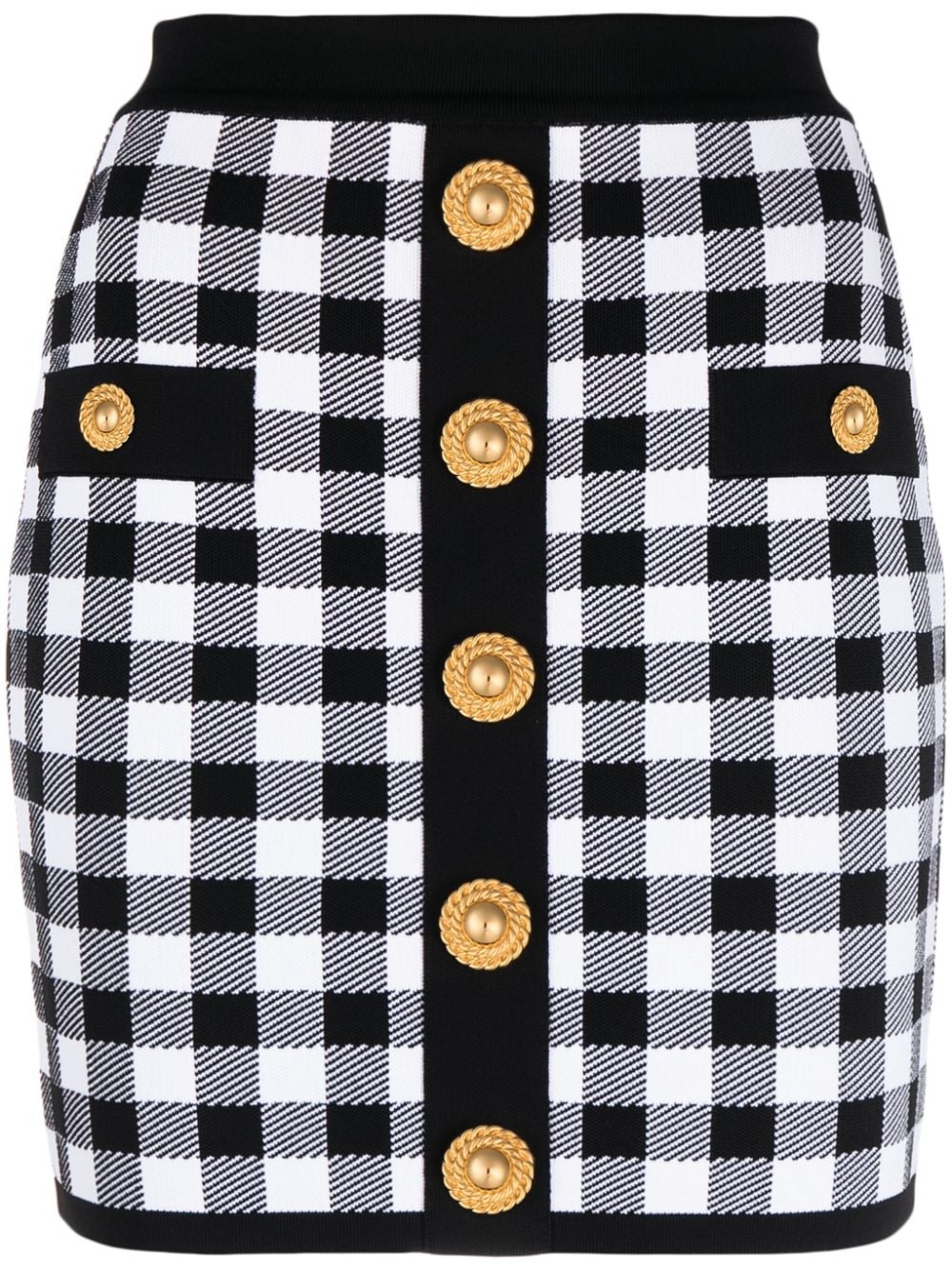 gingham fine-knit miniskirt Combining Parisian elegance with signature embellished details, this Balmain skirt is knitted to a streamlined silhouette decorated with six decorative Balmain Chain golden buttons, illuminating the graphic black-and-white gingham backdrop. It is complete with two front faux pockets. Highlights - Black/white - Fine knit - Gingham check pattern - Embossed gold-tone buttons - Gold-tone hardware - Faux pocket detail - Ribbed waistband - Rear zip fastening - Thigh-length - Straight hem Made in France Composition Viscose 90%, Polyamide 10% SIZE & FIT Model measurements Height 5 ft 9 in(1.76 m) Bust/Chest 33.07 in(84 cm) Hips 34.64 in(88 cm) Waist 25.59 in(65 cm) Measurement HIPS 32.28 in(82 cm) LENGTH 17.32 in(44 cm) WAIST 22.83 in(58 cm) FittingInformation This mini-length skirt is intended to be worn high on the waist Made with a midweight knit, this piece offers some stretch This piece fits true to size – take your usual size Washing instructions Hand Wash