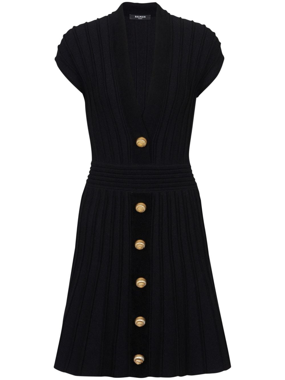 buttoned velvet mini dress Highlights - Black - Stretch-design - Velvet - Embossed gold-tone buttons - V-neck - Front button fastening - Pleat detailing - Short sleeves - Fitted waistline - Flared skirt Made in France Composition Viscose 79%, Polyester 13%, Polyamide 8%