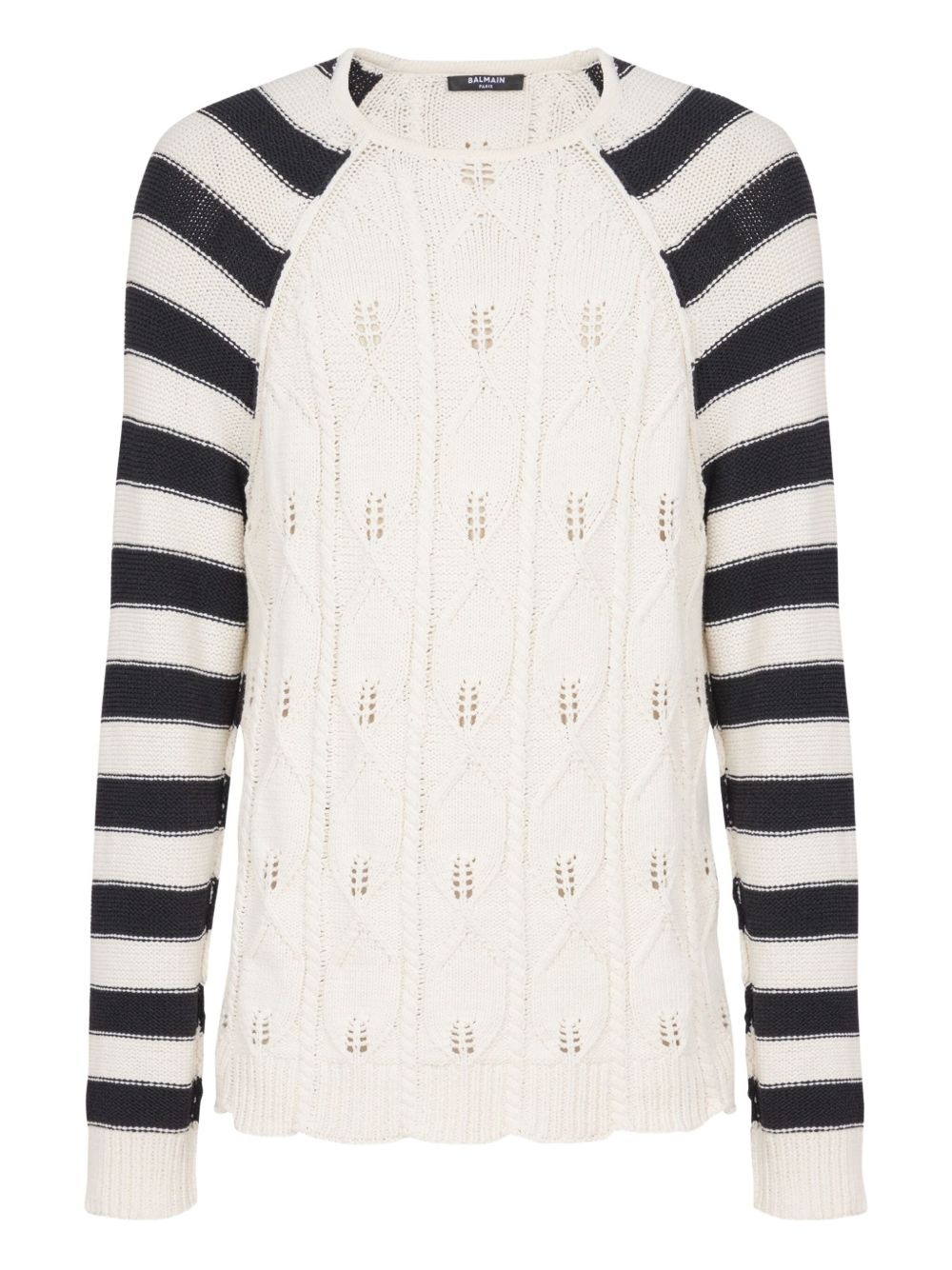 cable-knit jumper Highlights - White - Horizontal stripe embroidery - Crew neck - Long sleeves Made in Italy Composition Lyocell 44%, Cotton 44%, Polyamide 12% Washing instructions Read Manufacturer Guidelines