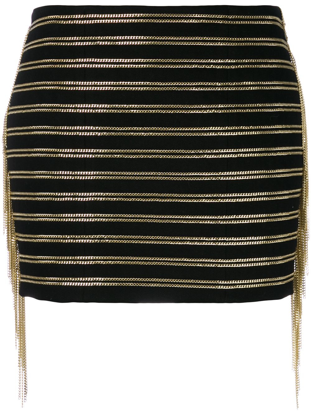 chain embellished skirt Balmain’s Spring/Summer ‘18 collection continues to reinvent the ‘embellished rock and roll star’, as heavy-duty metal hardware, glamorous embellishing and a multitude of sumptuous leather are introduced to classic silhouettes. Crafted from black and gold-tone cotton blend, this chain embellished skirt from Balmain features a high waist, a gold-tone chain trim, a short length, a short length and a chain fringe to the sides. Made in Italy Composition Lining: Viscose 52%, Cotton 48% Outer: Aluminium 100%, Cotton 98%, Spandex/Elastane 2% SIZE & FIT Model measurements Height 5 ft 11 in(1.8 m) Bust/Chest 31.49 in(80 cm) Hips 35.82 in(91 cm) Waist 24.8 in(63 cm) Washing instructions Dry Clean Only