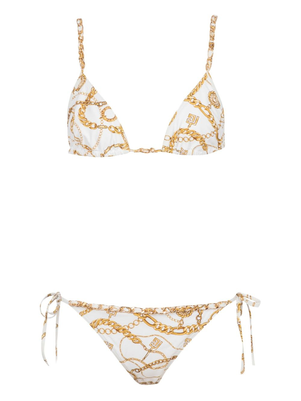 chain-print triangle bikini Highlights - White - Chain print - Triangle top - Tie-side briefs - Braided straps - Gold-tone chain pattern - Be mindful to try on swimwear over your own garments. Made in Italy Composition Polyamide 85%, Elastane 15% Washing instructions Read Manufacturer Guidelines