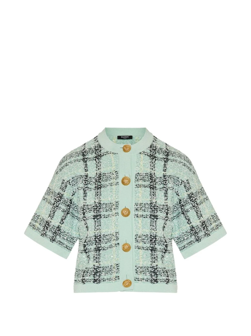 checked button-up cardigan Highlights - Green - Check pattern - Round neck - Short sleeves - Gold-tone buttons Made in Italy Composition Polyamide 41%, Viscose 36%, Polyester 12%, Cotton 9%, Steel 2% Washing instructions Read Manufacturer Guidelines
