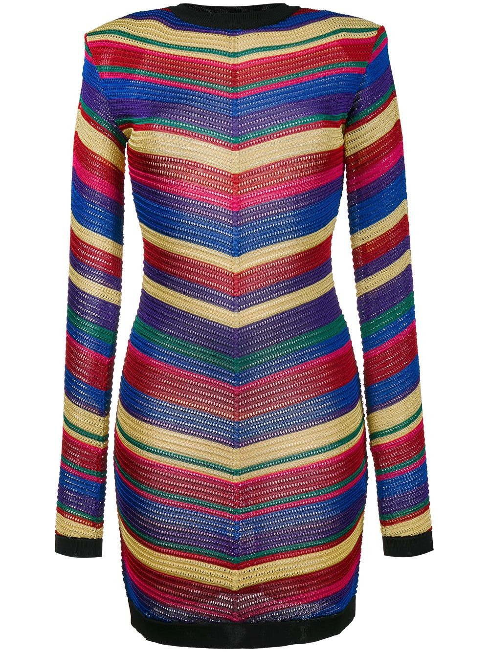 chevron knit dress Multicoloured chevron knit dress from Balmain featuring a round neck, a striped pattern, long sleeves, a woven effect and a short length. Made in France Composition Outer: Viscose 100% SIZE & FIT Model measurements Height 5 ft 9 in(1.75 m) Bust/Chest 32.67 in(83 cm) Hips 36.22 in(92 cm) Waist 24.8 in(63 cm) Washing instructions Dry Clean Only