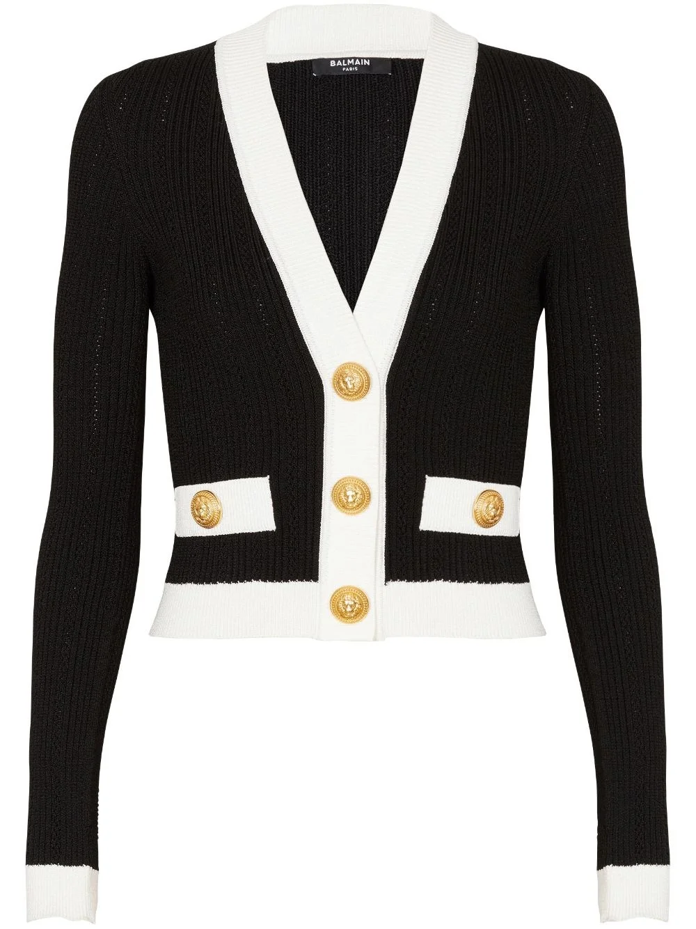 contrast-border ribbed knit cardigan Highlights - Black/white - Ribbed knit - Contrasting border - Embossed gold-tone buttons - V-neck - Long sleeves - Straight hem Made in Italy Composition Viscose 84%, Polyester 16% Washing instructions Specialist Cleaning