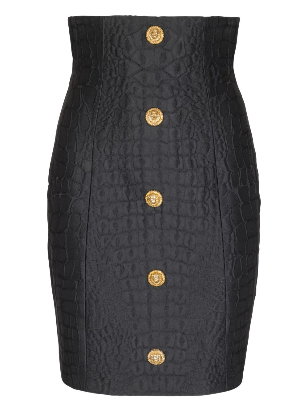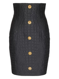 crocodile-effect button mini skirt Highlights - Black - Crocodile-effect jacquard - High waist - Gold-lion head buttons - Front-button fastening - Pencil shape Imported Composition Outer: Polyester 77%, Silk 17%, Acrylic 6% Lining: Viscose 52%, Cotton 48% Washing instructions Read Manufacturer Guidelines