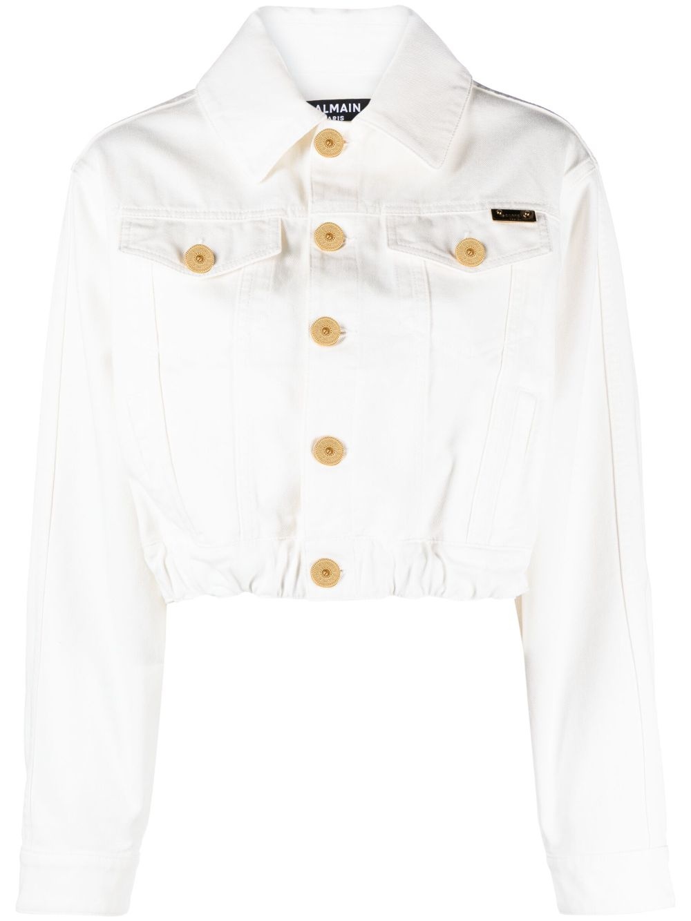 cropped denim jacket A classic design infused with signature flair and sports-inspired details, this white denim jacket from Balmain is enhanced with engraved gold-tone buttons and a matching logo plaque at the chest. The cropped silhouette and elasticated hemline nod to athleisure. Highlights - Off-white - Cotton - Denim - Classic collar - Front button fastening - Embossed gold-tone buttons - Two chest flap pockets - Gold-tone logo plaque - Long sleeves - Buttoned cuffs - Elasticated hem - Straight hem - Cropped Made in Italy Composition Lining: Cotton 65%, Elastane 35% Outer: Cotton 100% SIZE & FIT Model measurements Height 5 ft 10 in(1.77 m) Bust/Chest 32.28 in(82 cm) Hips 35.03 in(89 cm) Waist 25.19 in(64 cm) FittingInformation Designed to be unstructured, offering a loose fit throughout Cropped in length Made from a midweight non-stretch fabric This piece fits true to size – take your usual size
