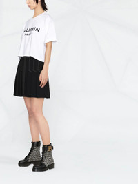 cropped logo-print T-shirt A longstanding champion of logomania, Balmain's T-shirt is emblazoned with the brand's signature at the chest. The contrasting black letters pop against the white background. Imported Composition Cotton 100% SIZE & FIT Model measurements Height 5 ft 11 in(1.8 m) Bust/Chest 31.49 in(80 cm) Hips 35.43 in(90 cm) Waist 25.19 in(64 cm) FittingInformation Designed for a relaxed fit, this piece allows for comfort and movement when worn Made from a midweight non-stretch fabric, this piece offers minimal elasticity when worn This piece fits true to size – take your usual size Measurement BUST 41.73 in(106 cm) LENGTH 16.92 in(43 cm)