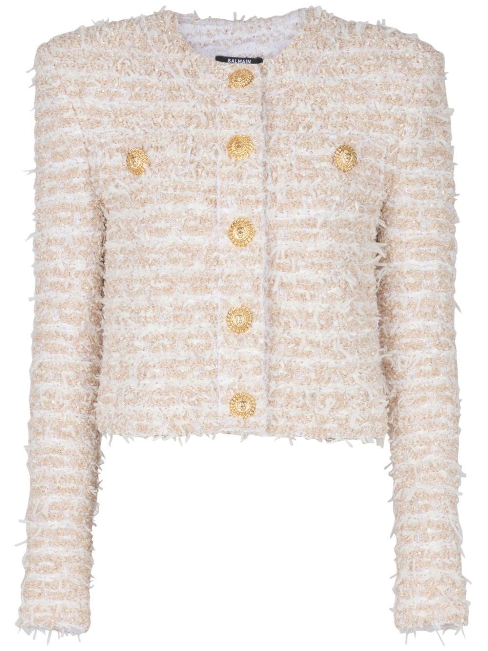 cropped tweed jacket Highlights - Gold-tone - Tweed - Front press-stud fastening - Collarless - Shoulder pads - Long sleeves - Two button-fastening chest pockets - Cropped straight hem Made in France Composition Polyamide 100%