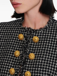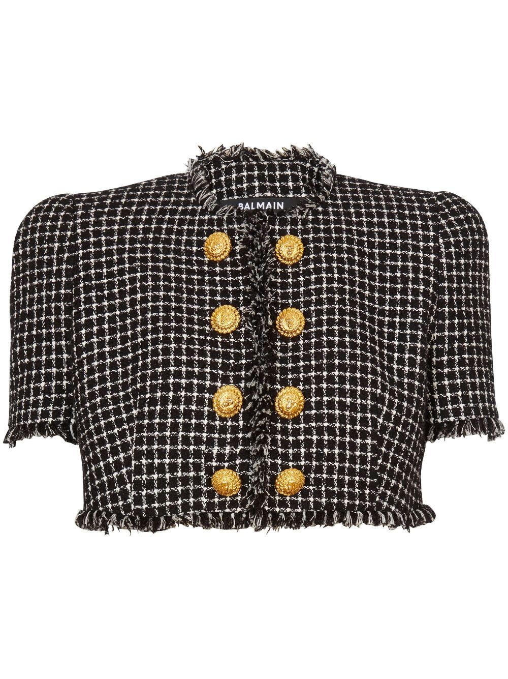 cropped tweed jacket Highlights - Black/white - Cotton blend - Tweed - Embossed gold-tone buttons - Double-breasted button fastening - Round neck - Short sleeves - Cropped Imported Composition Cotton 86%, Polyamide 14% Washing instructions Specialist Cleaning