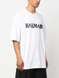 crystal-logo cotton T-shirt Fusing its streetwear side with glamorous roots, Balmain adorns this white cotton T-shirt with signature logo lettering across the front, embellished with contrasting black crystals and sequins for a light-catching finish. Highlights - White - Cotton - Crew neck - Crystal logo embellishment - Short sleeves - Straight hem Imported Composition Cotton 100%, Epoxy Resin 50%, Brass 40%, glass 10% SIZE & FIT Model measurements Height 6 ft 2 in(1.88 m) Bust/Chest 36.61 in(93 cm) Hips 37.79 in(96 cm) Waist 28.74 in(73 cm) Washing instructions Dry Clean Only