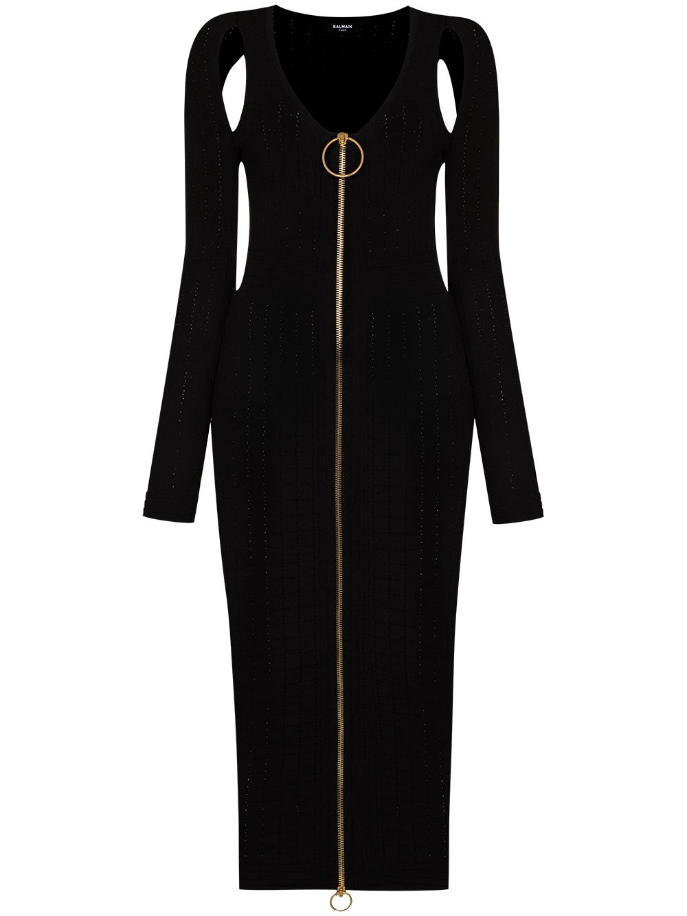 cut-out detail fitted dress Unapologetically Balmain, this midi dress is punctuated by multiple details that showcase the label's opulent style. Presented in a black hue, it features cut-out detailing, a V-neck and a bold two-way zip fastening on the front for added boldness. Made in France Composition Viscose 83%, Polyester 17% SIZE & FIT Model measurements Height 5 ft 10 in(1.78 m) Bust/Chest 30.7 in(78 cm) Hips 33.85 in(86 cm) Waist 22.44 in(57 cm) FittingInformation This piece fits true to size. We recommend you get your regular size Cut for a slim fit Made with a mid-weight fabric Washing instructions Dry Clean Only