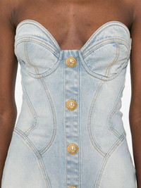 denim mini dress Highlights - Light blue - Concealed rear fastening - Logo patch to the rear - Sweetheart neck - Strapless Made in Italy Composition Outer: Cotton 98%, Spandex/Elastane 2% Lining: Polyester 65%, Cotton 35% SIZE & FIT Model measurements Height 5 ft 11 in(1.8 m) Bust/Chest 32.67 in(83 cm) Hips 36.22 in(92 cm) Waist 24.4 in(62 cm) FittingInformation Designed for a close fit throughout Constructed from stretch denim, this piece offers a stretch fit with durability