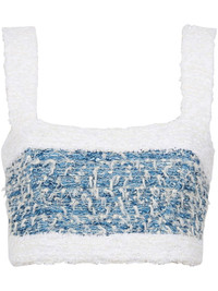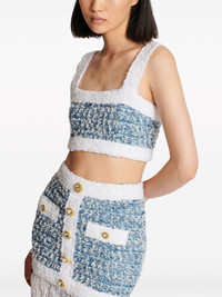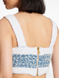 denim tweed crop top Boasting an intricate denim tweed construction, this Balmain top is crafted to a structured silhouette. It's rendered in a vibrant blue and white colourway and cropped for a contemporary touch. Highlights - Blue/white - Denim - Tweed - Contrasting trim - Square neck - Sleeveless - Cropped - Rear zip fastening Made in France Composition Viscose 53%, Linen/Flax 17%, Cotton 14%, Polyester 11%, Polyamide 5% Washing instructions Specialist Cleaning