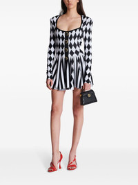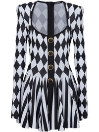 diamond-intarsia knitted mini dress Highlights - Black/white - Knitted construction - Diamond pattern - Patterned intarsia knit - Decorative button detailing - Sweetheart neck - Rear zip fastening - Long sleeves - Thigh-length - Straight hem Made in France Composition Viscose 100%