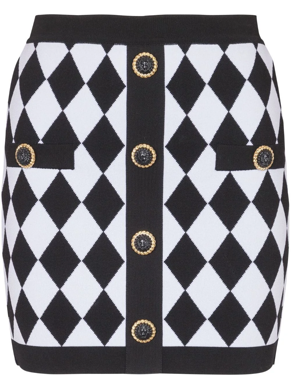 diamond-intarsia knitted miniskirt Highlights - Black/white - Knitted construction - Diamond pattern - Patterned intarsia knit - Decorative button detailing - Rear zip fastening - Thigh-length - Straight hem Made in France Composition Viscose 88%, Polyester 10%, Polyamide 2% Washing instructions Read Manufacturer Guidelines