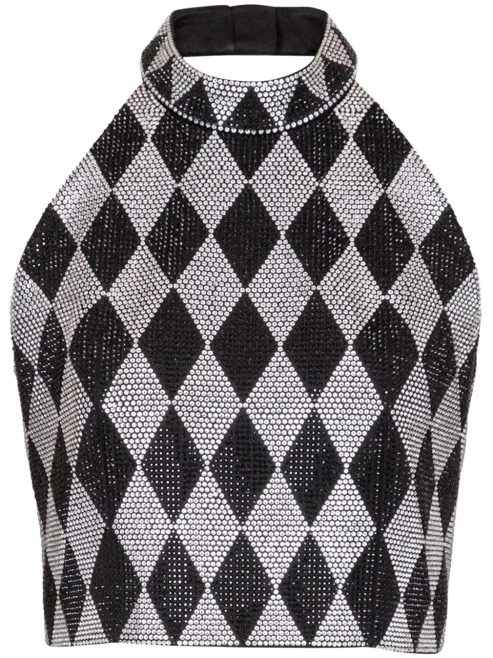 diamond-print rhinestone crop top Highlights - Black/grey - Diamond print - Rhinestone embellishment - Halterneck - Sleeveless - Cropped - Straight hem Made in Italy Composition Viscose 90%, Polyamide 10%
