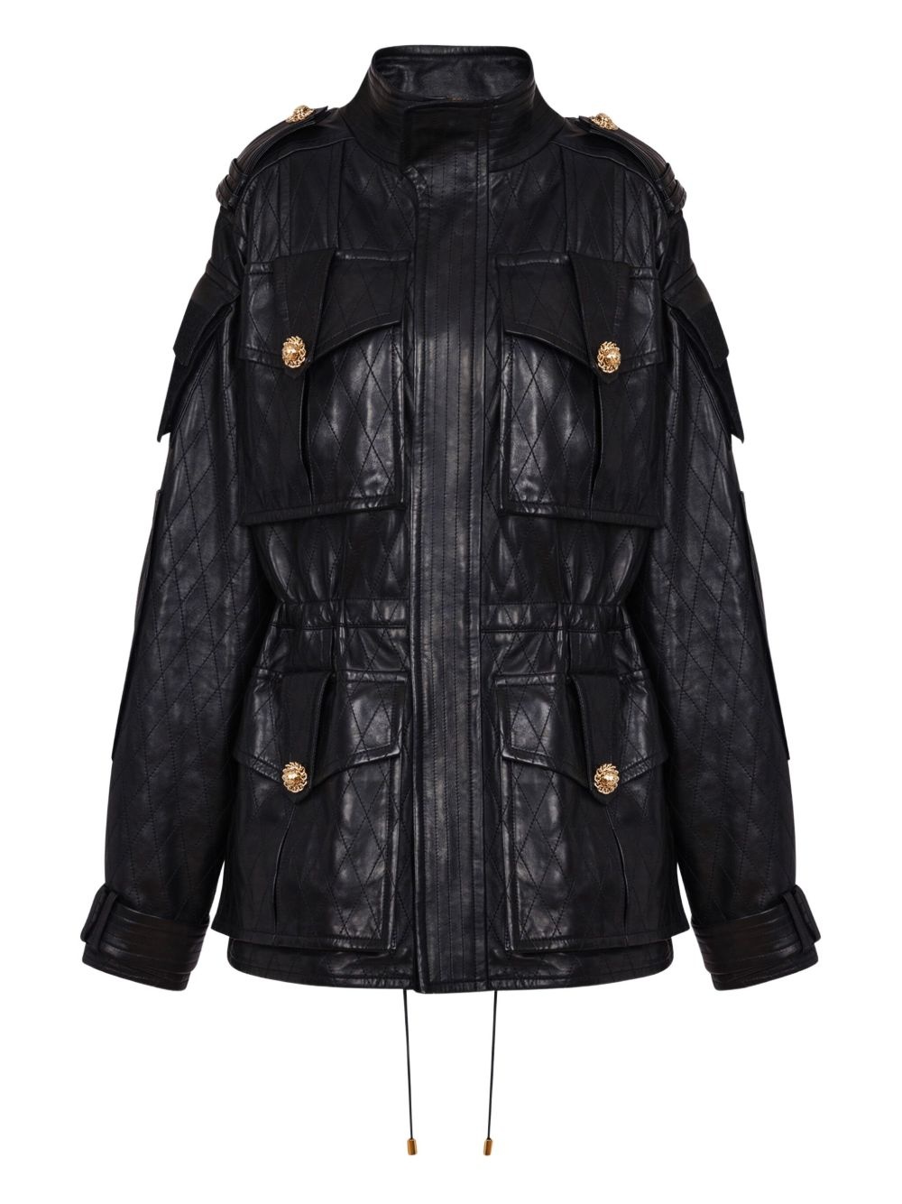 diamond-stitched leather parka coat Highlights - Black - Concealed front fastening - Four front flap pockets - Buttoned-cuff sleeves - Stand-up collar Imported Composition Lambskin 100% Washing instructions Read Manufacturer Guidelines