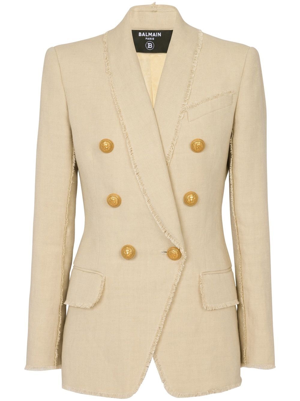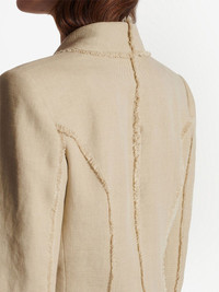 double-breasted fray-trimmed blazer Highlights - Sand beige - Linen/flax - Hemp - Peak lapels - Double-breasted button fastening - Long sleeves - Buttoned cuffs - Chest welt pocket - Two front flap pockets - Full lining Imported Composition Body: Linen/Flax 57%, Hemp 43% Washing instructions Specialist Cleaning