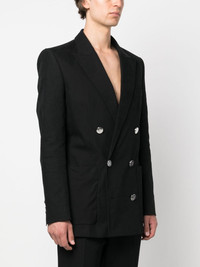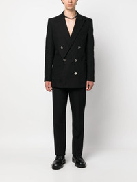 double-breasted cotton blazer Cut from soft cotton, this double-breasted blazer from Balmain presents a structured silhouette. Logo-embossed silver-tone buttons add a signature touch to the design's refined aesthetic. Highlights - Black - Cotton - Logo-embossed buttons - Peak lapels - Double-breasted button fastening - Long sleeves - Buttoned cuffs - Straight hem Imported Composition Outer: Cotton 68%, Polyester 26%, Polyamide 6% Lining: Cotton 100%, Acetate 65%, Viscose 35% SIZE & FIT Model measurements Height 6 ft 1 in(1.85 m) Bust/Chest 35.43 in(90 cm) Hips 35.82 in(91 cm) Waist 27.55 in(70 cm) FittingInformation Designed for a slim fit, offering a comfortable fit that sits just away from the body The vented hem offers movement at the rear Made from a midweight non-stretch fabric This piece fits true to size – take your usual size Washing instructions Dry Clean Only