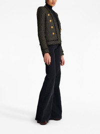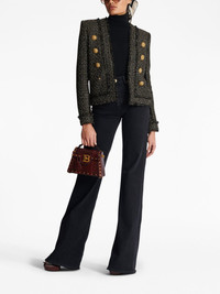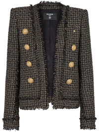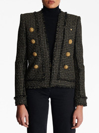 double-breasted tweed jacket This jacket is emblematic of Balmain’s affinity for gold-tone hardware. Present within each collection, the logo-embossed buttons have become an instantly recognisable design detail that allows the brand to infuse its signature essence of refined glamour into classic silhouettes. Highlights - Black/gold-tone - Tweed detailing - Collarless - Long sleeves - Button cuffs - Double-breasted button fastening - Frayed trims - Straight hem Imported Composition Body: Viscose 48%, Polyester 34%, - 18% SIZE & FIT Measurement SLEEVE LENGTH 25.59 in(65 cm) LENGTH 22.44 in(57 cm)