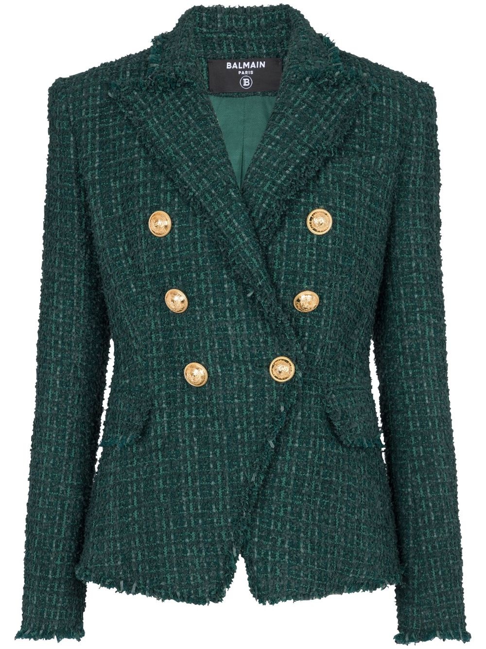 double-breasted tweed jacket This jacket is emblematic of Balmain’s affinity for gold-tone hardware. Present within each collection, the logo-embossed buttons have become an instantly recognisable design detail that allows the brand to infuse its signature essence of refined glamour into classic silhouettes. Highlights - Green/black - Wool blend - Peak lapels - Long sleeves - Button cuffs - Double-breasted button fastening - Two front flap pockets - Straight hem Imported Composition Body: Polyamide 79%, Virgin Wool 15%, Cotton 6% SIZE & FIT Measurement SLEEVE LENGTH 18.89 in(48 cm) LENGTH 24.4 in(62 cm) WAIST 30.7 in(78 cm) BUST 35.43 in(90 cm)