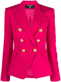 double-breasted wool blazer Highlights - Fuchsia pink - Virgin wool - Gold-tone buttons - Peak lapels - Double-breasted button fastening - Long sleeves - Buttoned cuffs - Two side flap pockets - Straight hem Imported Composition Lining: Viscose 52%, Cotton 48% Outer: Virgin Wool 100% SIZE & FIT Model measurements Height 5 ft 11 in(1.8 m) Bust/Chest 30.7 in(78 cm) Hips 35.03 in(89 cm) Waist 24.4 in(62 cm) Measurement SLEEVE LENGTH 24.4 in(62 cm) LENGTH 24.01 in(61 cm) WAIST 30.31 in(77 cm) BUST 36.61 in(93 cm) HIPS 39.37 in(100 cm) Shoulder Width 5.11 in(13 cm) FittingInformation Designed for a slim fit that sits just away from the body offering a close yet comfortable fit The internal shoulder pads offer a structured shape Made from a midweight non-stretch fabric This piece fits true to size – take your usual size Washing instructions Dry Clean Only