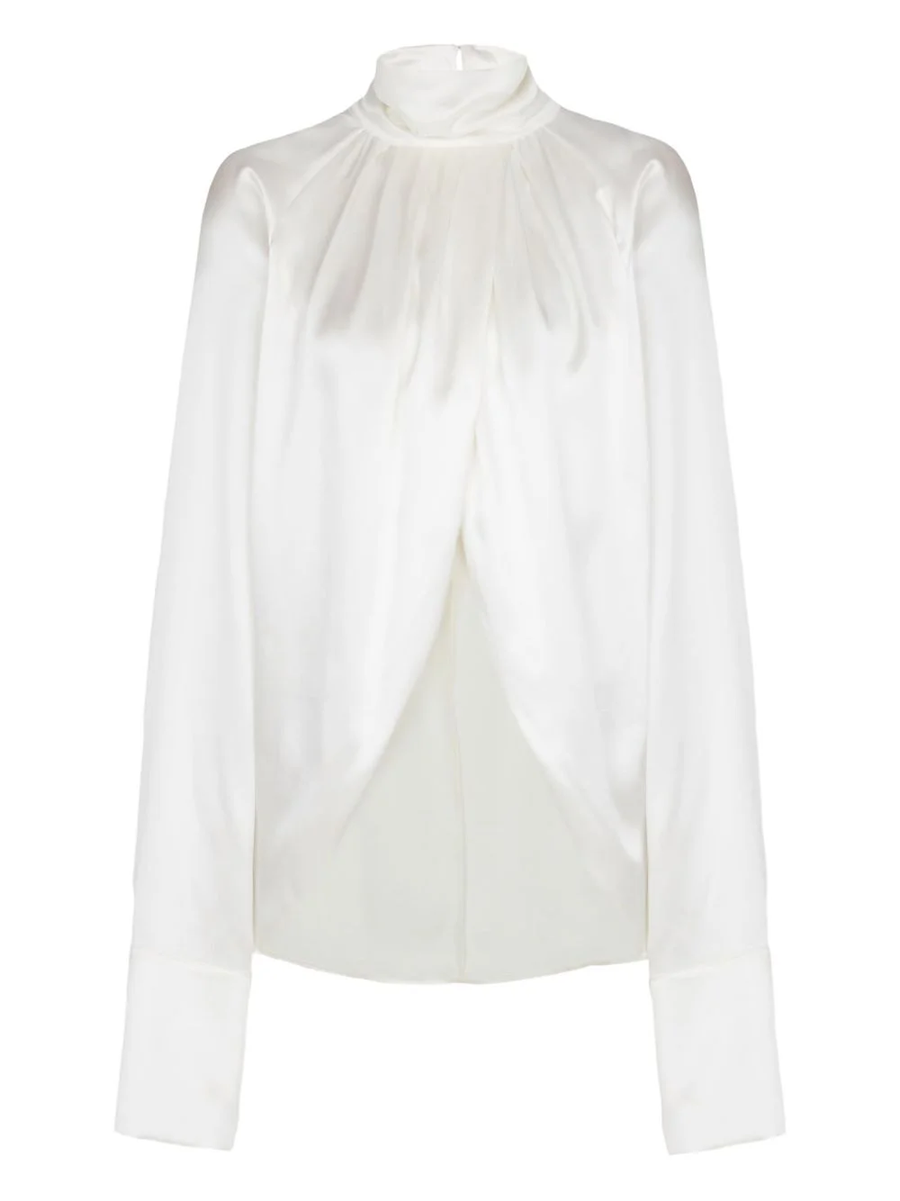 draped long-sleeve blouse Highlights - White - Long sleeves - Button fastening - Draped front - Cuff detail Imported Composition Organic Silk 100% Washing instructions Specialist Cleaning