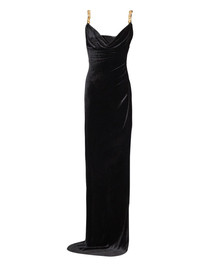 embellished velvet slit dress Highlights - Black - Velvet - Draped cowl neck - Gold-tone embellishments straps - Side slit - Floor-length hem Imported Composition Viscose 82%, Silk 18% Washing instructions Read Manufacturer Guidelines