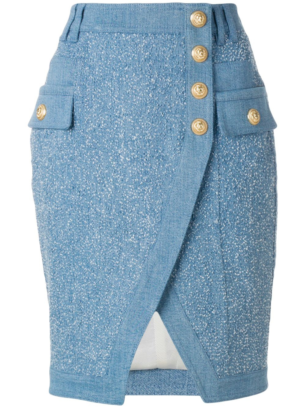 embossed-button skirt Olivier Rousteing continues his evolution of Balmain’s classic styles into the brand’s SS18 collection and beyond. Equal amounts decorative, daring and refined, these garments are an elevation of Parisian craftsmanship. Crafted in Italy, this embossed-button skirt features a high waist, gold-tone embossed buttons, a front button fastening, a waistband with belt loops, a wrap style front and a mid-length. Made in Italy Composition Outer: Cotton 98%, Polyurethane 2% Lining: Viscose 52%, Cotton 48% SIZE & FIT Model measurements Height 5 ft 11 in(1.8 m) Bust/Chest 33.85 in(86 cm) Hips 35.03 in(89 cm) Waist 24.8 in(63 cm)