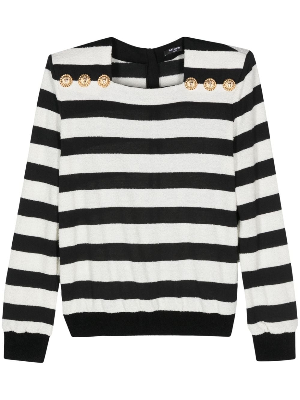 embossed-button striped jumper Highlights - Black/white - Knitted construction - Horizontal stripe pattern - Embossed gold-tone buttons - Square neck - Shoulder pads - Long sleeves - Straight hem - Concealed rear zip fastening Made in France Composition Acrylic 49%, Cotton 30%, Polyamide 21%