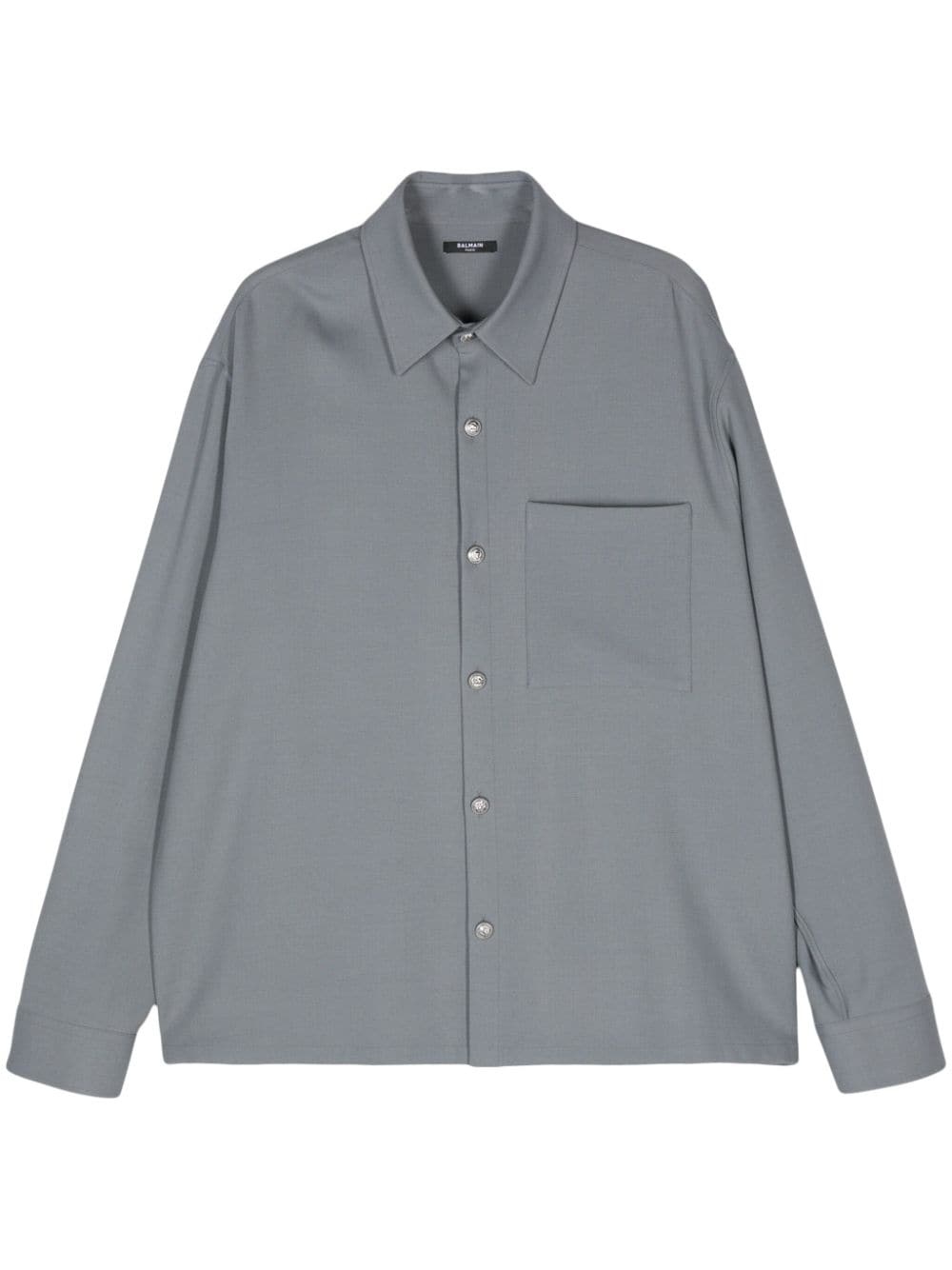 embossed-buttons shirt Highlights - Grey - Embossed silver-tone buttons - Pointed flat collar - Front button fastening - Long sleeves - Buttoned cuffs - Chest patch pocket - Straight hem Made in Italy Composition Viscose 57%, Wool 39%, Spandex/Elastane 4%