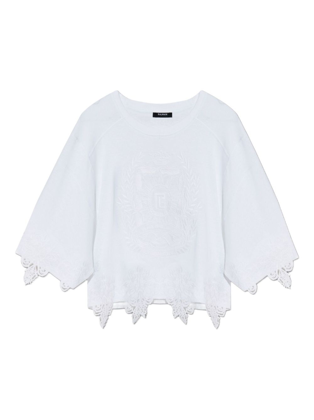 embroidered lace-trimmed top Highlights - White - Embroidered emblem - Lace trim - Short sleeves - Cropped hem Imported Composition Linen/Flax 94%, Elastane 6% Washing instructions Read Manufacturer Guidelines