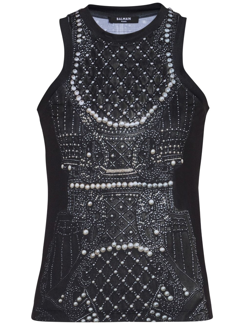 embroidery-print tank top Highlights - Black - Jersey texture - Satin finish - All-over embroidery print - Round neck - Sleeveless - Straight hem Imported Composition Polyester 84%, Elastane 16%