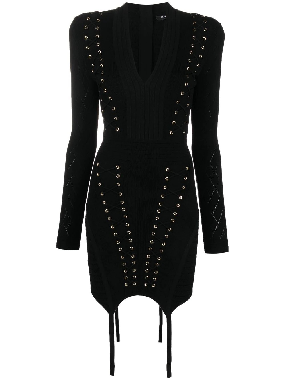 eyelet-detail lace-up dress jet black eyelet detailing ribbed detailing faux lace-up design V-neck long sleeves Made in France Composition Viscose 83%, Polyester 17% SIZE & FIT Model measurements Height 5 ft 11 in(1.8 m) Bust/Chest 31.49 in(80 cm) Hips 35.82 in(91 cm) Waist 24.8 in(63 cm) Measurement HIPS 30.7 in(78 cm) LENGTH 34.25 in(87 cm) WAIST 24.4 in(62 cm) Washing instructions Dry Clean Only