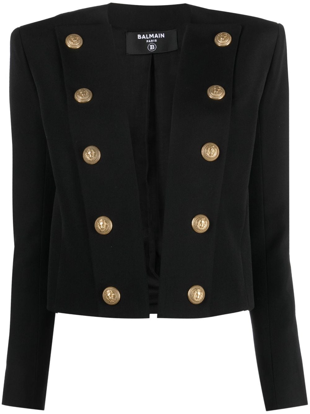 fitted wool jacket A signature riff on military styles, this Balmain jacket is lined with gold-tone lion head buttons down the front. It’s cut from pure wool to a fitted, clean-lined silhouette that’s enhanced with straight lapels and padded shoulders. Highlights - Black - Cotton blend - Open front - Embossed gold-tone buttons - Shoulder pads - Long sleeves - Buttoned cuffs - Straight hem Made in Italy Composition Lining: Viscose 52%, Cotton 48% Outer: Virgin Wool 100% SIZE & FIT Model measurements Height 5 ft 10 in(1.78 m) Bust/Chest 30.7 in(78 cm) Hips 34.64 in(88 cm) Waist 23.22 in(59 cm) Measurement SLEEVE LENGTH 24.01 in(61 cm) LENGTH 20.86 in(53 cm) WAIST 39.37 in(100 cm) BUST 39.37 in(100 cm) FittingInformation Designed for a slim fit that sits just away from the body offering a close yet comfortable fit The internal shoulder pads offer a structured shape Made from a midweight non-stretch fabric This piece fits true to size – take your usual size