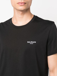 flocked-logo cotton T-shirt Crafted from cotton jersey, this black Balmain T-shirt is minimally detailed with a contrasting flocked logo at the chest. Highlights - Black - Cotton - Flocked logo - Crew neck - Short sleeves - Straight hem Imported Composition Cotton 100% SIZE & FIT Model measurements Height 6 ft 1 in(1.85 m) Bust/Chest 35.82 in(91 cm) Hips 37.79 in(96 cm) Waist 29.13 in(74 cm) FittingInformation Designed for a slim fit, offering a comfortable fit that sits just away from the body Made from a midweight non-stretch fabric, this piece offers minimal elasticity when worn This piece fits true to size – take your usual size Washing instructions Machine Wash