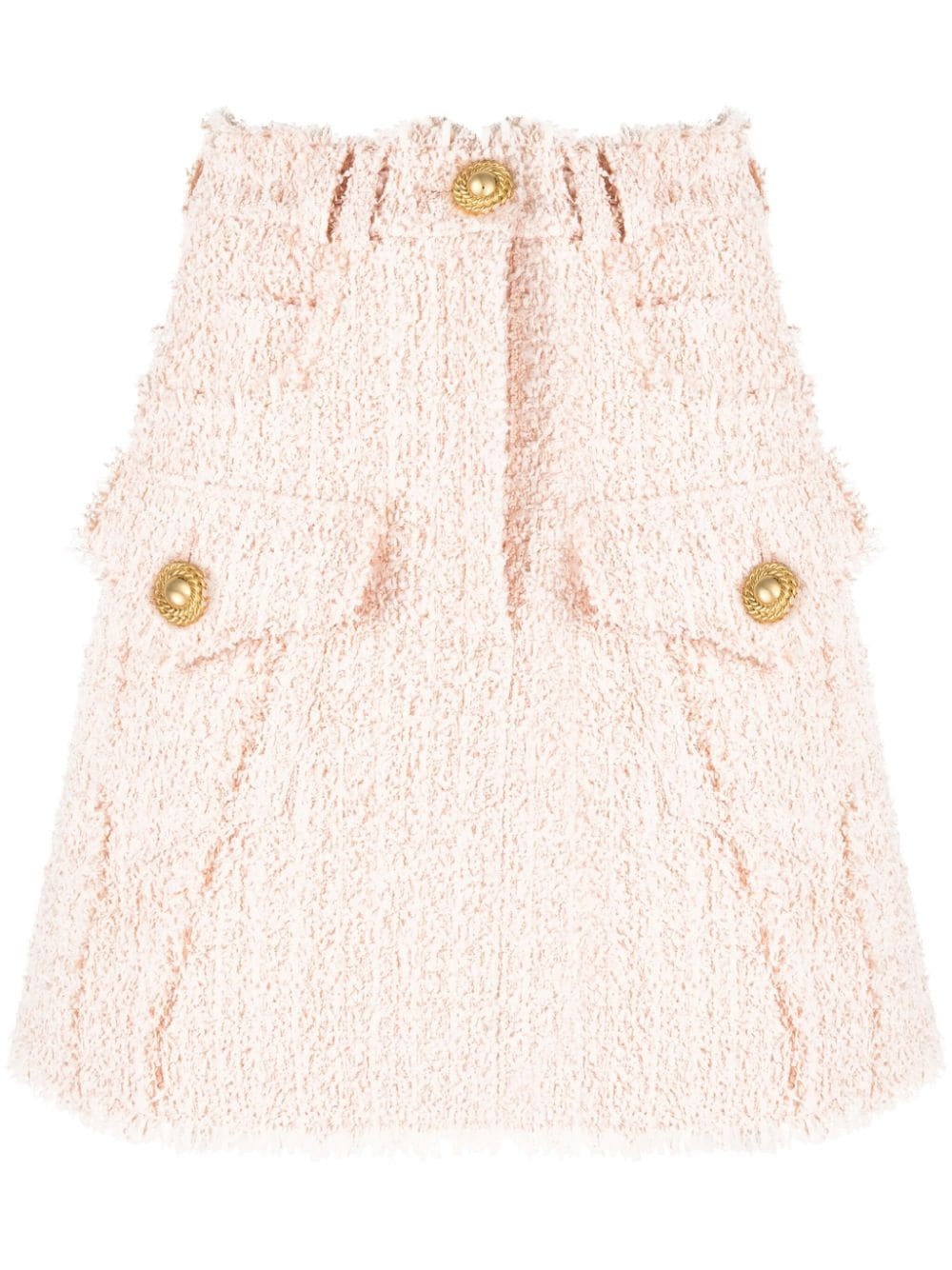 frayed tweed miniskirt The classic wool tweed is presented with a twist in this Balmain's miniskirt. In light beige, it's finished with a frayed effect. Two front flap pockets add an utilitarian style to the piece. Highlights - Beige - Tweed - Textured finish - Frayed detailing - High-waisted - Belt loops - Gold-tone buttons - Front button and zip fastening - Classic five pockets - Two front button-fastening flap pockets - Frayed hem - Above-knee length - Satin lining Imported Composition Outer: Polyamide 79%, Virgin Wool 15%, Cotton 6% Lining: Viscose 52%, Cotton 48% SIZE & FIT Model measurements Height 5 ft 10 in(1.78 m) Bust/Chest 31.49 in(80 cm) Hips 37 in(94 cm) Waist 23.62 in(60 cm) FittingInformation This mini-length skirt is intended to be worn high on the waist Made from a midweight non-stretch fabric This piece fits true to size – take your usual size Washing instructions Dry Clean Only