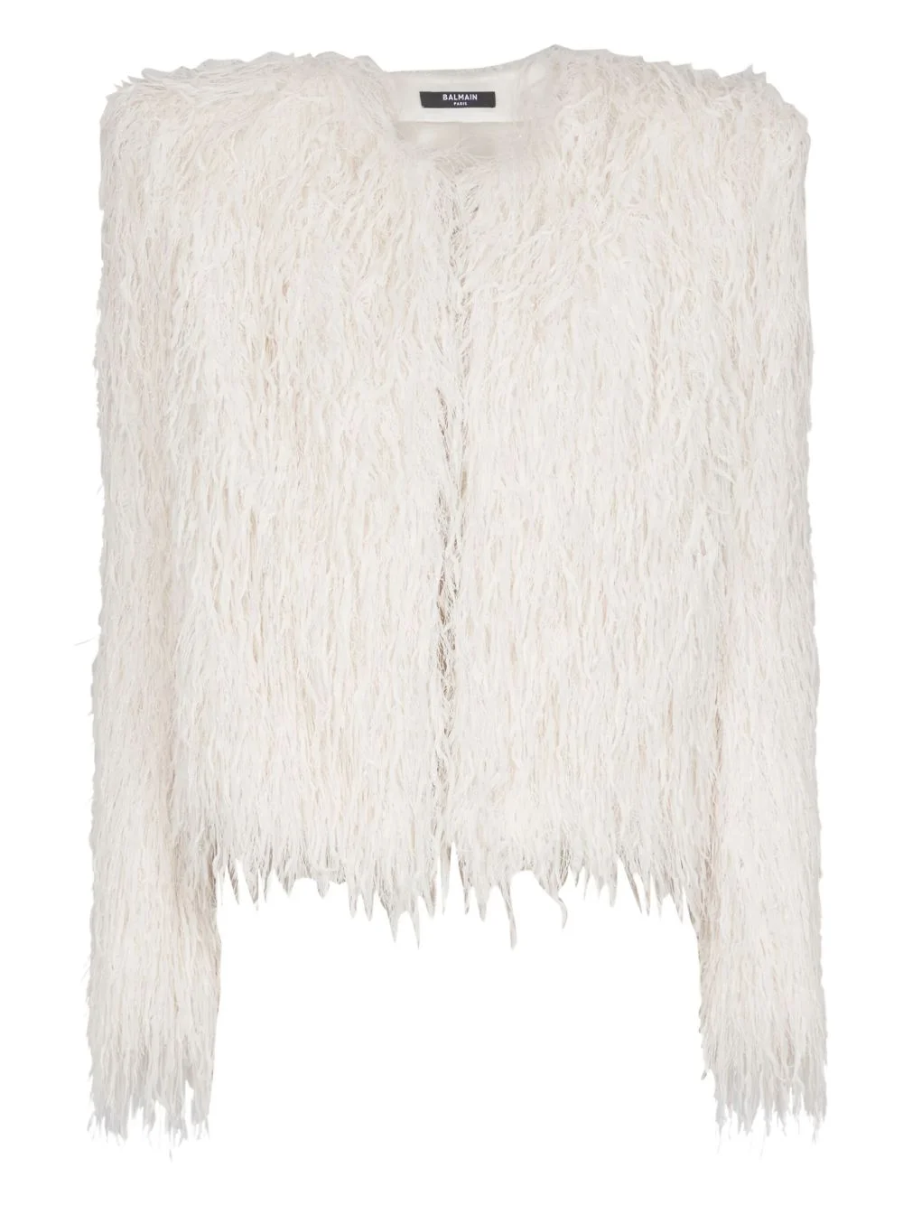 fringed jacket Highlights - White - Fringed detail - Round neck - Long sleeves - Open front - Shoulder pads Made in France Composition Polyester 100% Washing instructions Read Manufacturer Guidelines