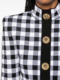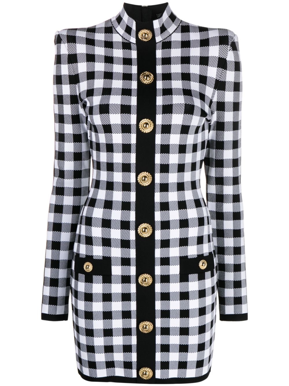 gingham mini dress The strong-shouldered silhouette of this Balmain mini dress is a recurring silhouette for the brand. It’s woven with a monochrome gingham pattern for visual impact and dotted with gilded chain-embossed buttons for an opulent touch. Highlights - Black/white - Fine knit - Gingham check pattern - Embossed gold-tone buttons - Mock neck - Shoulder pads - Long sleeves - Decorative button detailing - Faux pocket detail - Straight hem - Thigh-length - Rear zip fastening Made in France Composition Viscose 90%, Polyamide 10% SIZE & FIT Model measurements Height 5 ft 11 in(1.8 m) Bust/Chest 31.49 in(80 cm) Hips 35.82 in(91 cm) Waist 24.8 in(63 cm) Measurement SLEEVE LENGTH 30.31 in(77 cm) HIPS 30.7 in(78 cm) LENGTH 33.07 in(84 cm) WAIST 24.4 in(62 cm) BUST 27.55 in(70 cm) FittingInformation Designed for a close fit throughout The internal shoulder pads offer a structured shape Made from a midweight non-stretch fabric, this piece offers minimal elasticity when worn This piece fits true to size – take your usual size Washing instructions Dry Clean Only