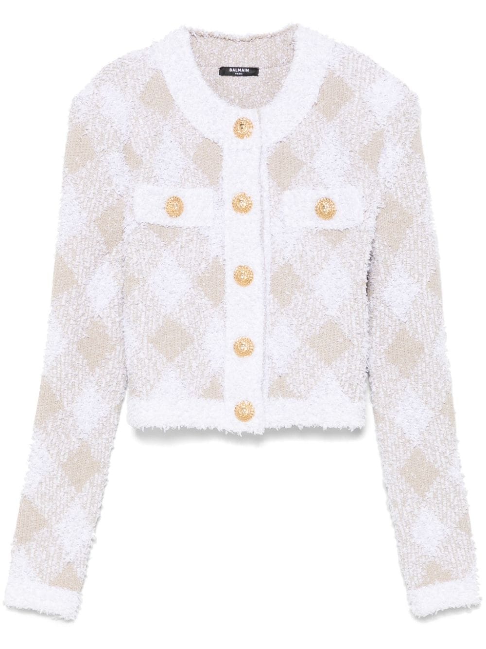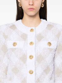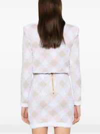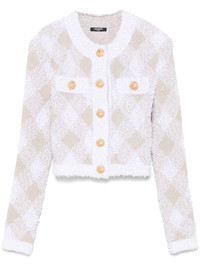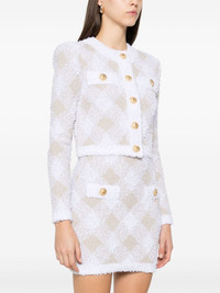 gingham tweed jacket Highlights - Beige/white - Knitted construction - Textured finish - Front press-stud fastening - Contrasting trim - Round neck - Gingham check pattern - Lurex detailing - Shoulder pads - Long sleeves - Gold-tone buttons - Faux pocket detail - Unlined - Straight hem - Cropped Made in France Composition Polyamide 47%, Viscose 42%, Polyester 8%, Metallized Polyester 3% SIZE & FIT Model measurements Height 5 ft 10 in(1.78 m) Bust/Chest 33.85 in(86 cm) Hips 36.61 in(93 cm) Waist 26.77 in(68 cm) FittingInformation Designed for a slim fit that sits just away from the body offering a close yet comfortable fit The internal shoulder pads offer a structured shape Made from a midweight non-stretch fabric, this piece offers minimal elasticity when worn Washing instructions Dry Clean Only