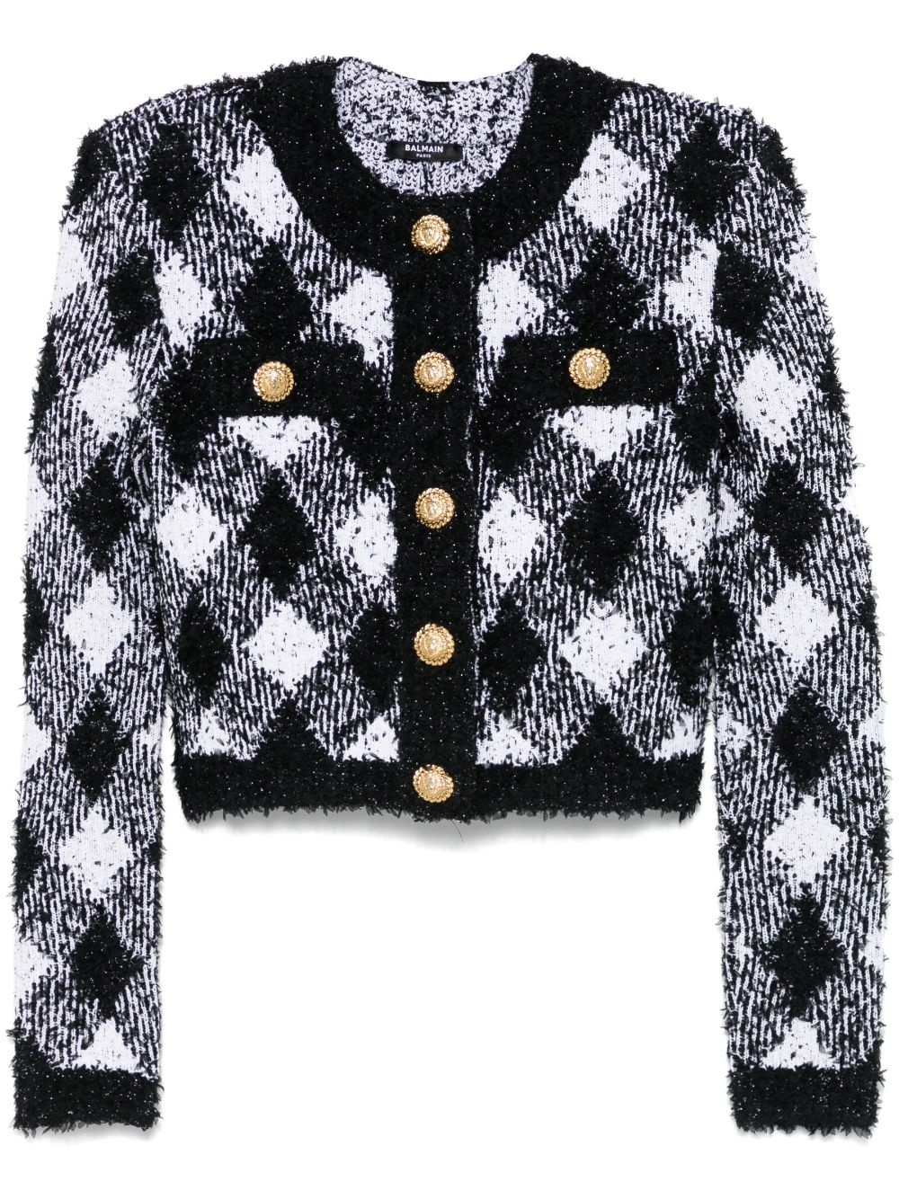 gingham tweed jacket Highlights - Black/white - Metallic threading - Tweed - Gingham check pattern - Front button fastening - Lion head motif - Gold-tone buttons - Two chest welt pockets - Round neck - Shoulder pads - Long sleeves - Straight hem - Unlined - Cropped Made in France Composition Polyamide 47%, Viscose 42%, Polyester 8%, Metallized Polyester 3% SIZE & FIT Model measurements Height 5 ft 10 in(1.78 m) Bust/Chest 33.85 in(86 cm) Hips 36.61 in(93 cm) Waist 26.77 in(68 cm) FittingInformation Designed for a slim fit that sits just away from the body offering a close yet comfortable fit The internal shoulder pads offer a structured shape Made from a midweight non-stretch fabric, this piece offers minimal elasticity when worn