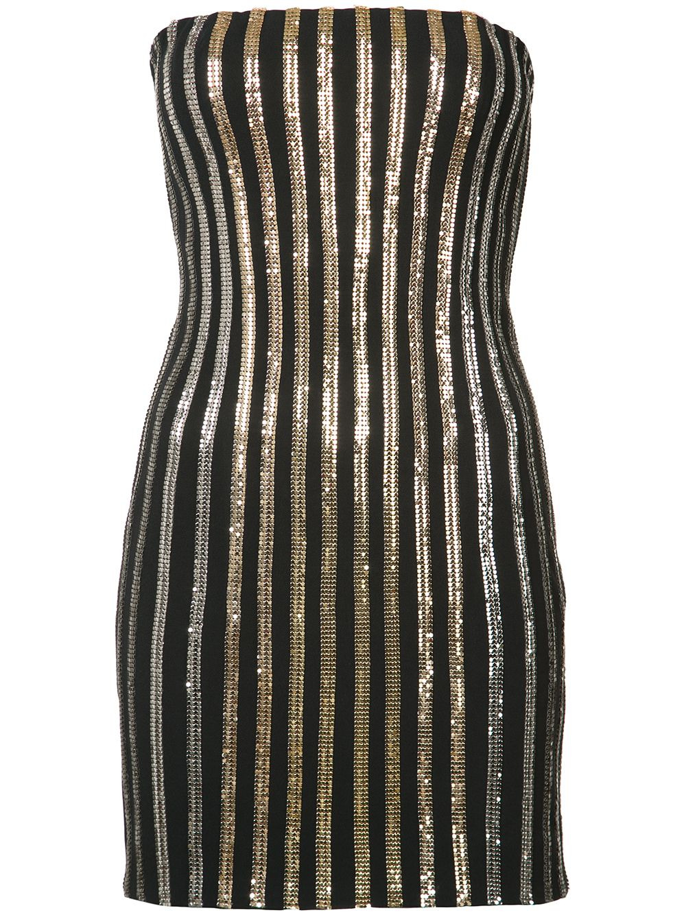 glitter stripe strapless dress Black and gold-tone glitter stripe strapless dress from Balmain featuring a slim fit, a rear zip fastening, gold-tone hardware and a short length. This item fits small, please select the next size up. Imported Composition Lining: Polyamide 66%, Spandex/Elastane 34% Brass 100% Outer: Acetate 70%, Viscose 26%, Polyester 4% SIZE & FIT Model measurements Height 5 ft 10 in(1.79 m) Bust/Chest 29.92 in(76 cm) Hips 33.07 in(84 cm) Waist 24.4 in(62 cm) Washing instructions Do Not Wash/Do Not Dry Clean
