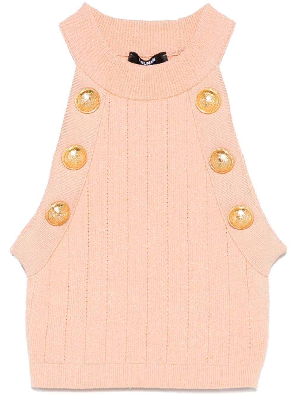 Cropped pale pink knit top with gold-tone buttons