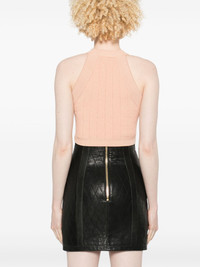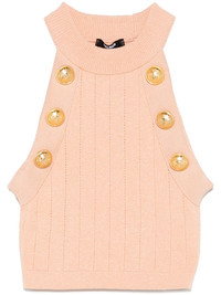 halterneck knitted crop top Highlights - Blush pink - Decorative button detailing - Sleeveless - Ribbed cuffs and hem Made in France Composition Viscose 83%, Polyester 17% SIZE & FIT Model measurements Height 5 ft 9 in(1.75 m) Bust/Chest 34.64 in(88 cm) Hips 36.61 in(93 cm) Waist 26.37 in(67 cm) FittingInformation Designed for a close fit throughout Made with a midweight knit, this piece offers some stretch