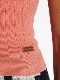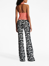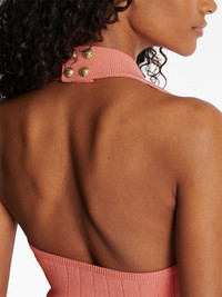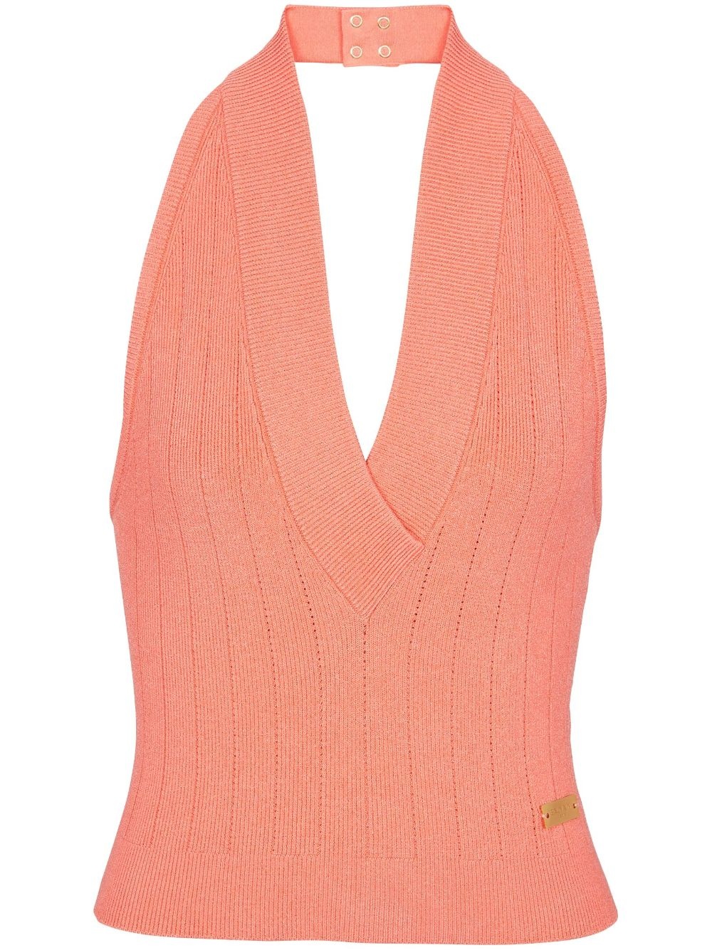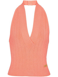 halterneck knitted top Part of the AW23 collection, this coral-hued top by Balmain features a fine ribbed knit that underlines the slim silhouette. With a V-halterneck, the garment is complete with a delicate logo plaque on the side. Highlights - Orange - Knitted construction - Fine ribbed - V-neck - Halterneck - Sleeveless - Gold-tone logo plaque - Ribbed hem - Straight hem Made in Italy Composition Body: Viscose 83%, Polyester 17%