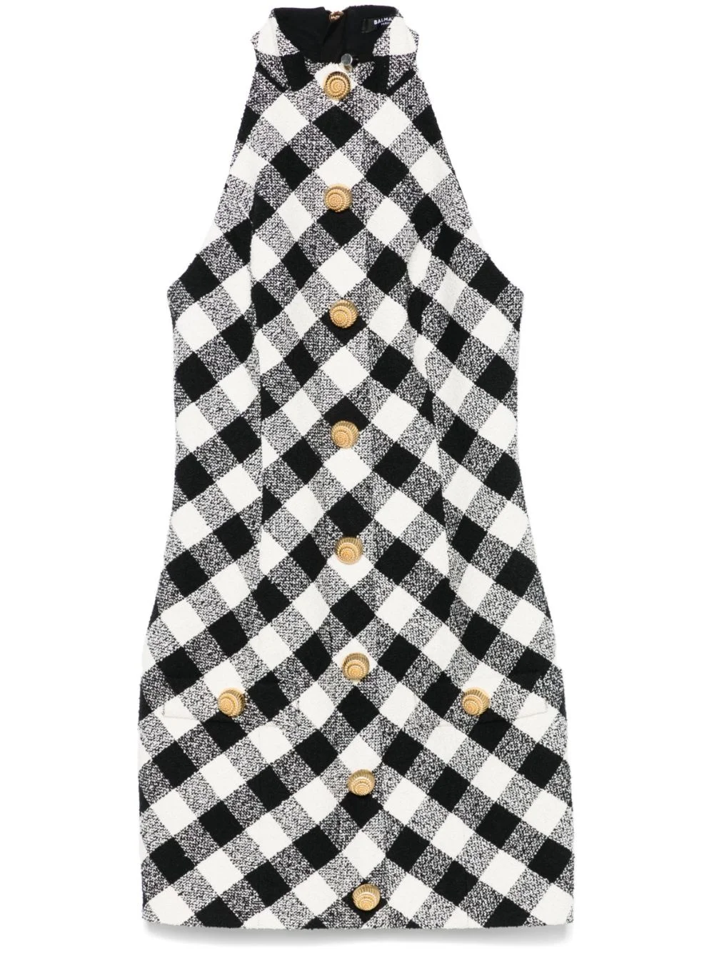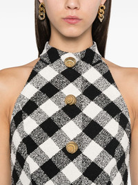 halterneck mini dress Highlights - Black/white - Cotton blend - Tweed - Gingham check pattern - Halterneck - Rear zip fastening - Sleeveless - Two chest welt pockets - Straight hem - Full lining Imported Composition Outer: Acetate 77%, Cotton 62%, Polyester 34%, Viscose 23%, Other fibres 4% Lining: Viscose 52%, Cotton 48% SIZE & FIT Model measurements Height 5 ft 10 in(1.78 m) Bust/Chest 33.85 in(86 cm) Hips 36.61 in(93 cm) Waist 26.77 in(68 cm)