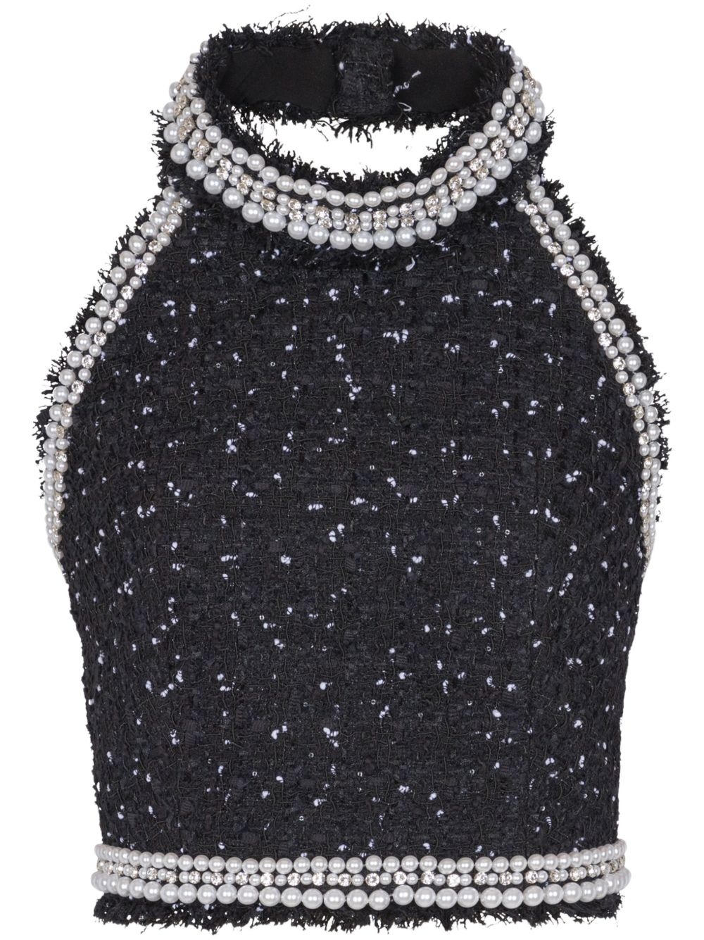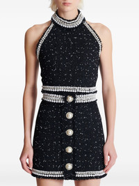 halterneck tweed cropped top Highlights - Black - Rear zip fastening - Sleeveless - Square open back - Faux-pearl embellishment Imported Composition Acetate 73%, Silk 27% Washing instructions Read Manufacturer Guidelines