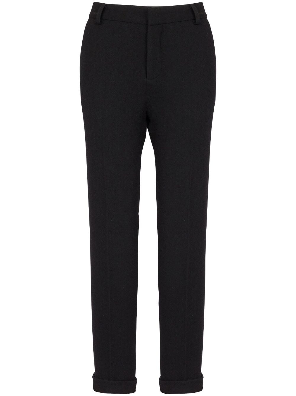 high-waisted tapered-leg trousers Balmain's effortlessly opulent design style is showcased on this pair of trousers through the use of sophisticated materials and a minimalist monochromatic hue. Highlights - Black - High waist - Tapered leg - Two side slit pockets Imported Composition Virgin Wool 100%